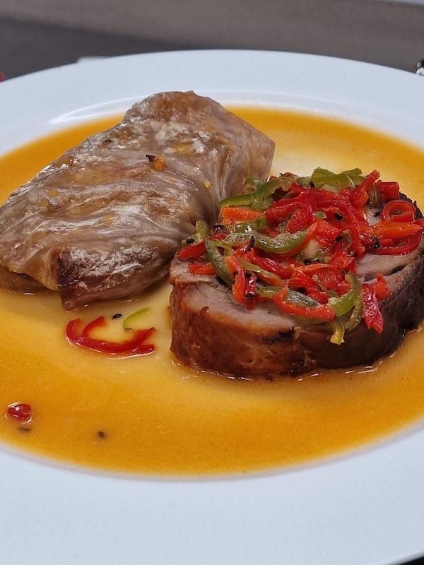 Pe 1 decembrie a fost prezentată o carne de porc (ceafă) gătită lent ca să devină fragedă, o sarma reinterpretată din varză coaptă și un sos de unt cu chimen. Ardeiul aduce vitamină C și prospețime, iar varza – probiotice, fibre, fitonutrienți, vitamine și minerale. E o farfurie românească, dar echilibrată: proteine din carne, probiotice din varză, condimente ca ajutor digestiv.