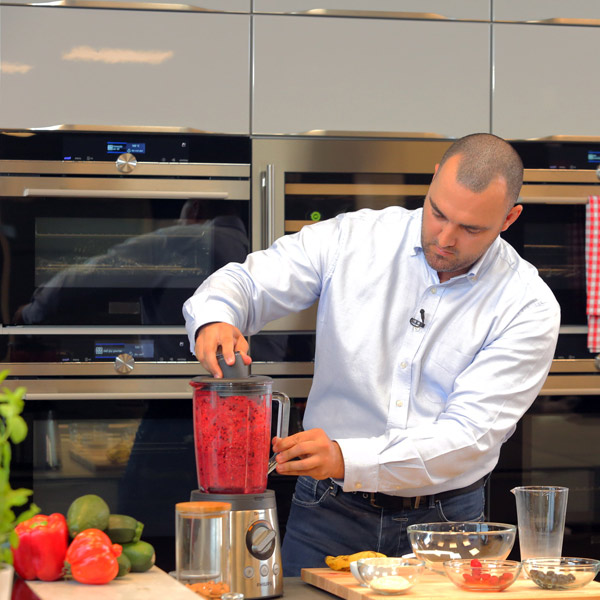 Ma avantajeaza si cana de sticla, mai usor de spalat si mai sanatoasa decat plasticul, mai ales daca folosim alimente fierbinti (cand facem o supa-crema sau un piure, de exemplu). Spatula ne ajuta sa amestecam bine ingredientele in timpul functionarii (are o lungime gandita astfel incat sa nu poata atinge lama de metal).
